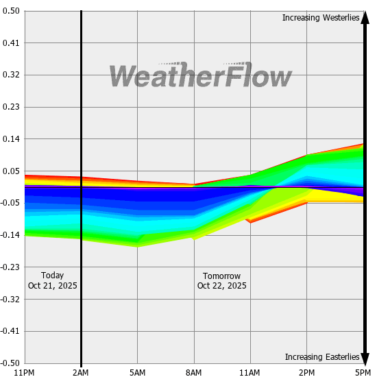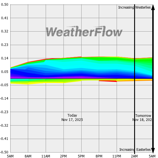 Computer forecast models generally can not resolve the topography of the Gorge and hence model predicted winds are often inaccurate. However, models can predict localized air pressure changes with a great deal of accuracy and it's these pressure differences (gradients) that drive the winds through the Gorge. The above "windbow" is a tool that our Meteorologists have developed to provide a powerful quick look of model predicted gradients.