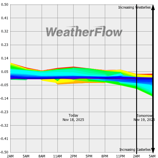 Computer forecast models generally can not resolve the topography of the Gorge and hence model predicted winds are often inaccurate. However, models can predict localized air pressure changes with a great deal of accuracy and it's these pressure differences (gradients) that drive the winds through the Gorge. The above "windbow" is a tool that our Meteorologists have developed to provide a powerful quick look of model predicted gradients.